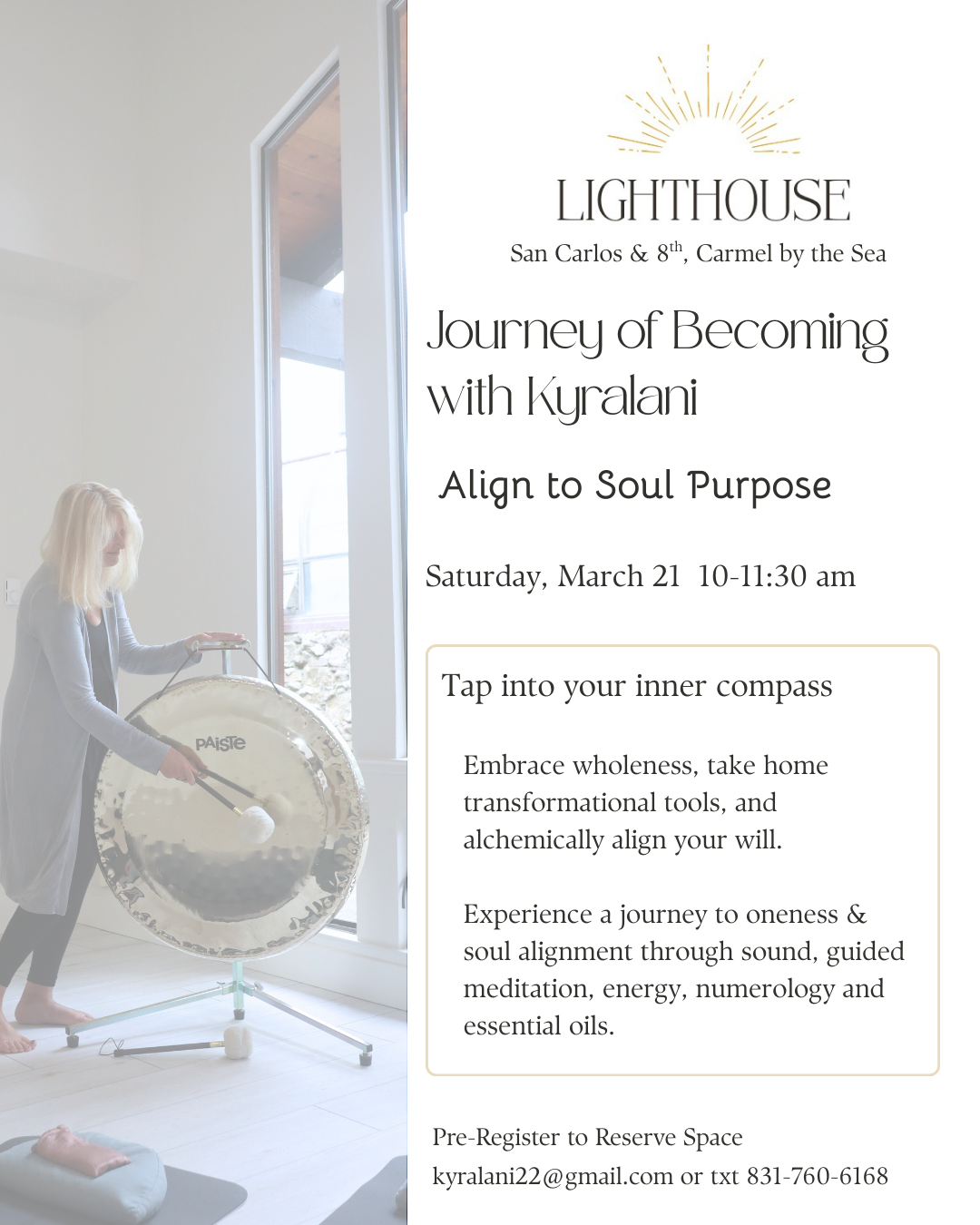 Embark on a three-month journey of self-discovery and growth, unlocking the truest version of yourself. Join us at the Lighthouse in Carmel, San Carlos & 8th, for this transformational series that takes advantage of the juicy creative part of 2026. We are crafting our seeds now of who we are becoming, that will carry us for the next 9 years.